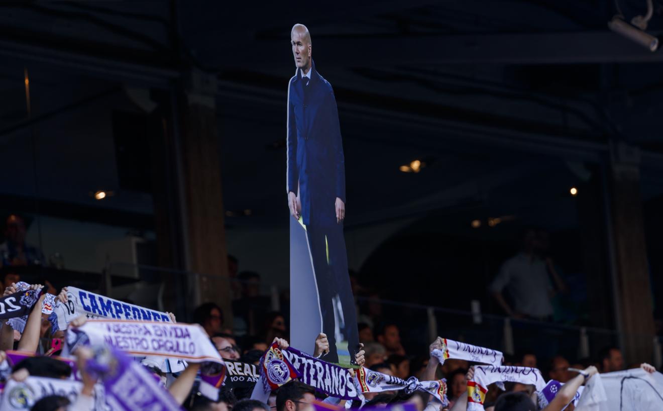 Os torcedores exibem uma silhueta de Zidane em seu relançamento no Bernabéu. Paulo Garcia