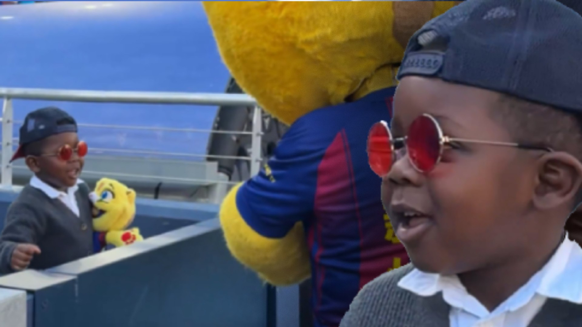 Keane, irmão de Lamin Yemal, se divertiu muito antes do jogo entre Barcelona e Levante e deixou esta adorável foto que a ESPN registrou com o mascote culé, Cat.