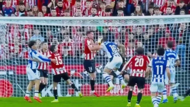 Real Sociedad marcou aos 45 minutos José Maria Sanchez Martinez Apontando para a marca do pênalti após uma bola de mão na área de pênalti LaporteEle disse: “Não sei por que ele não foi até o monitor para assistir ao jogo. É um chute a gol e o jogador do Athletic está com o braço em forma de L. Ele abriu e está segurando. Como há gritos com outras mãos, a penalidade máxima deveria ter sido indicada.” Perez Borol No programa ‘Markado’ da Rádio Marka.