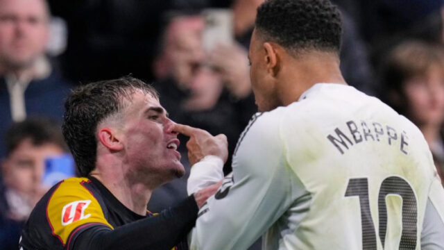 Esta foi praticamente a última jogada do jogo. A bola saiu pela linha lateral e o carioca pressionou Rodrigo para pegar a bola e sacar rápido.. Uma ação pela qual Mbappé o culpou ao ver seu companheiro no chão.
