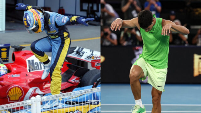 Assim, quando Alcaraz confirmou a sua vitória, quis festejá-la em grande estilo, homenageando também a famosa celebração que Fernando Alonso assinou ao vencer o Grande Prémio do Japão de 2006 em Suzuka com a Renault. Foi colocado como guindaste em memória da imagem do piloto espanhol.