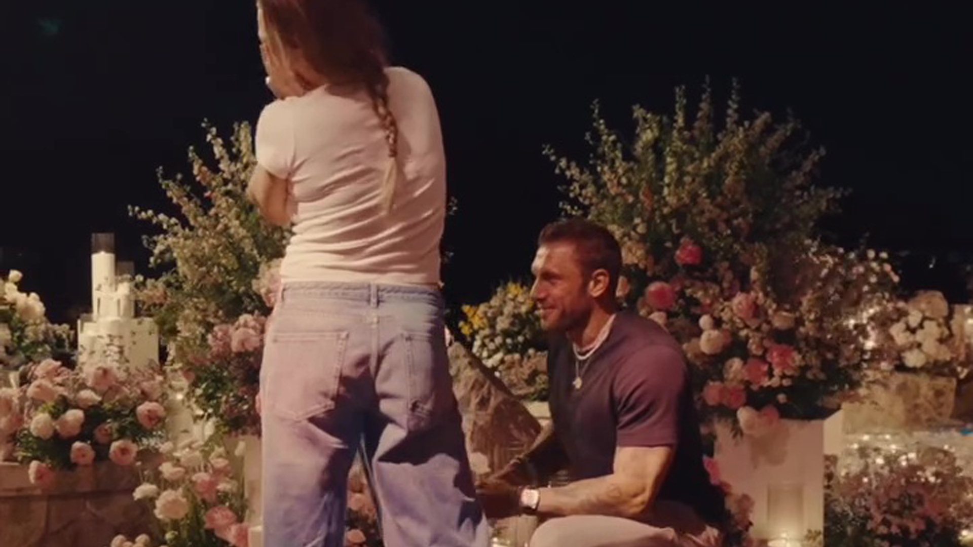 Ela recuou incrédula antes que o vídeo mostrasse o casal se abraçando e exibindo seu novo anel de diamante.