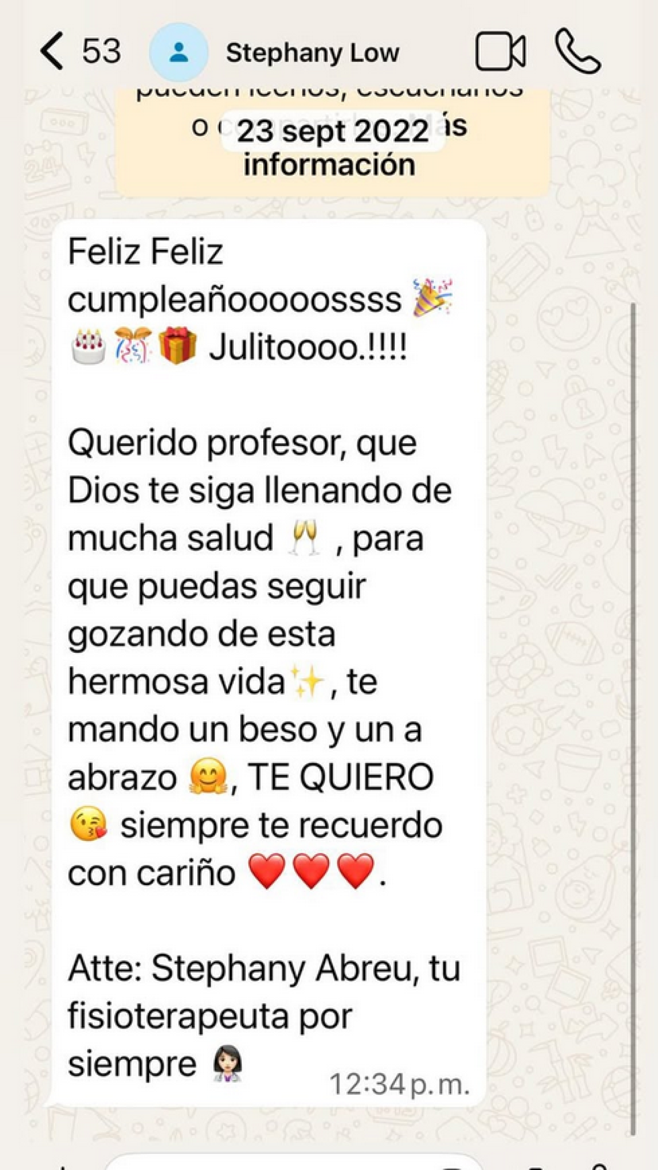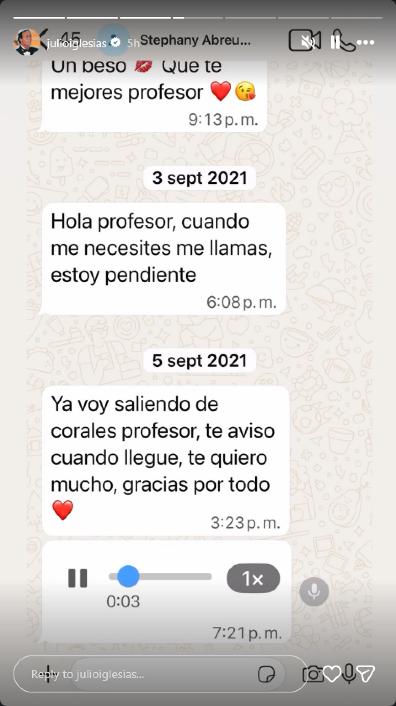 Julio Iglesias compartilhou com seus mais de 647.000 seguidores no Instagram. Capturas de tela de mensagens de WhatsApp de seus ex-funcionários entre 2021 e 2023.