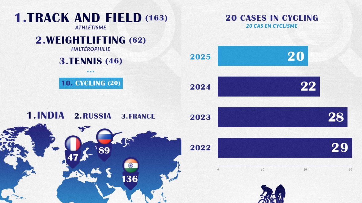 Os dados adquirem uma dimensão global. O ciclismo ficou em décimo lugar em casos de doping e trapaça esportiva no ano passado. Os atletas lideraram a lista com 163 casos, sendo o levantamento de peso 63 e o tênis 46, incluindo 27 relacionados a fraude esportiva. Para um esporte que há anos é citado como o elo mais fraco do alto rendimento, a reviravolta é evidente.