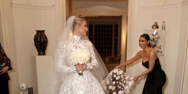 Paris Hilton parecia radiante em um vestido Oscar de la Renta personalizado, um dos quatro looks que ela usou em seu casamento de 2021. Seu véu era bordado com flores delicadas, ecoando a renda delicada em suas mangas e corpete.