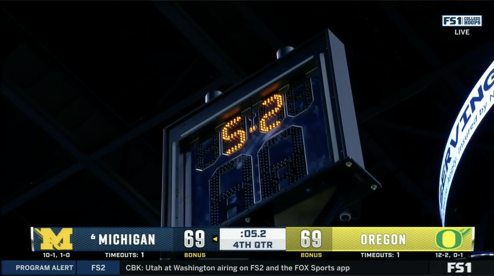 Depois de quase 40 minutos de lances livres exaustivos e uma longa seca de gols, Michigan e Oregon estavam empatados em 69. Os Ducks se recuperaram de um buraco de 16 pontos no intervalo para empatar o jogo faltando 1:30 para o fim, e continuaria assim enquanto as equipes trocavam sustos. Os Wolverines defenderam bem o suficiente para forçar uma posse de bola longa e desperdiçada no Oregon para permitir que Michigan recuperasse a bola faltando 21 segundos para o fim. Depois que o relógio caiu para 12 e pediu um tempo limite, Michigan começou sua longa e frustrante posse de bola. Sword tentou quebrar o defensor faltando 5,2 segundos para o fim, para estreitar o sucesso. Ele errou uma bandeja faltando 5,2 segundos para o fim. Seu companheiro de equipe Te Yala Delphos pegou um rebote ofensivo faltando 5,2 segundos para o fim e conseguiu sua própria tentativa de rebatimento faltando 5,2 segundos para o fim, momento em que alguém finalmente percebeu que o relógio havia parado em 5,2 segundos.
