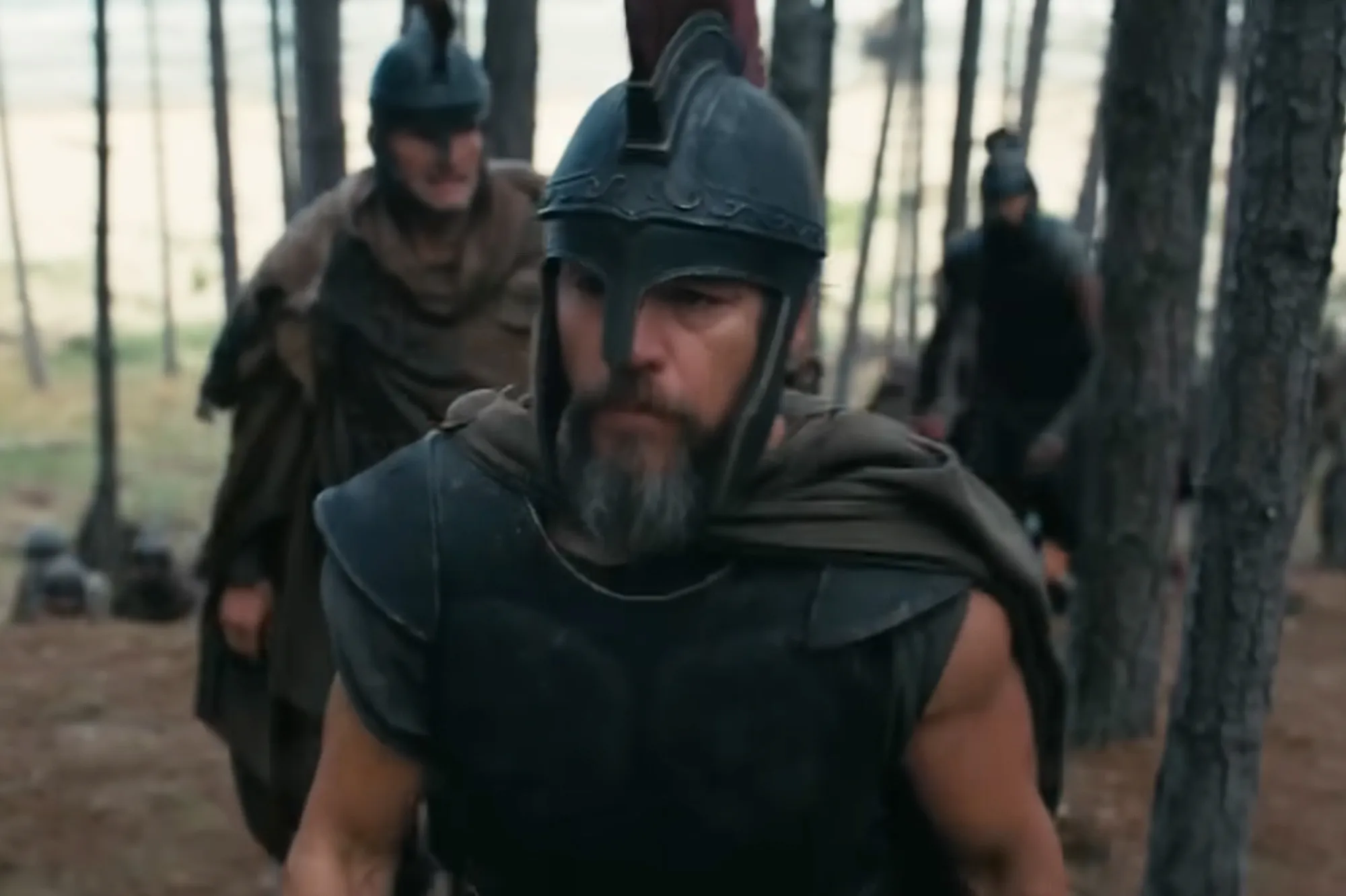O trailer mostra o personagem de Scott em pé sobre uma mesa, anunciando a notícia a um grupo de soldados, incluindo Telêmaco de Tom Holland e Menelau de Jon Bernthal.