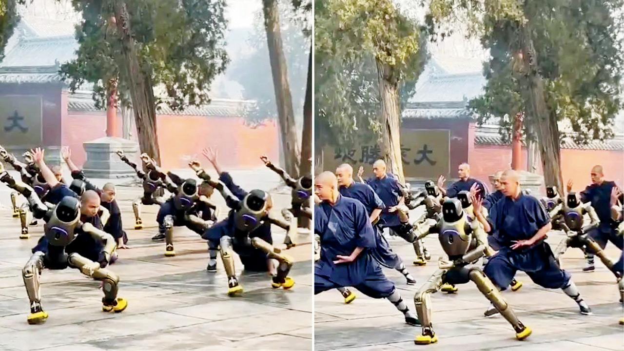 A empresa chinesa de robótica Agibot exibiu seus robôs humanóides praticando artes marciais com monges no histórico Templo Shaolin, na China.
