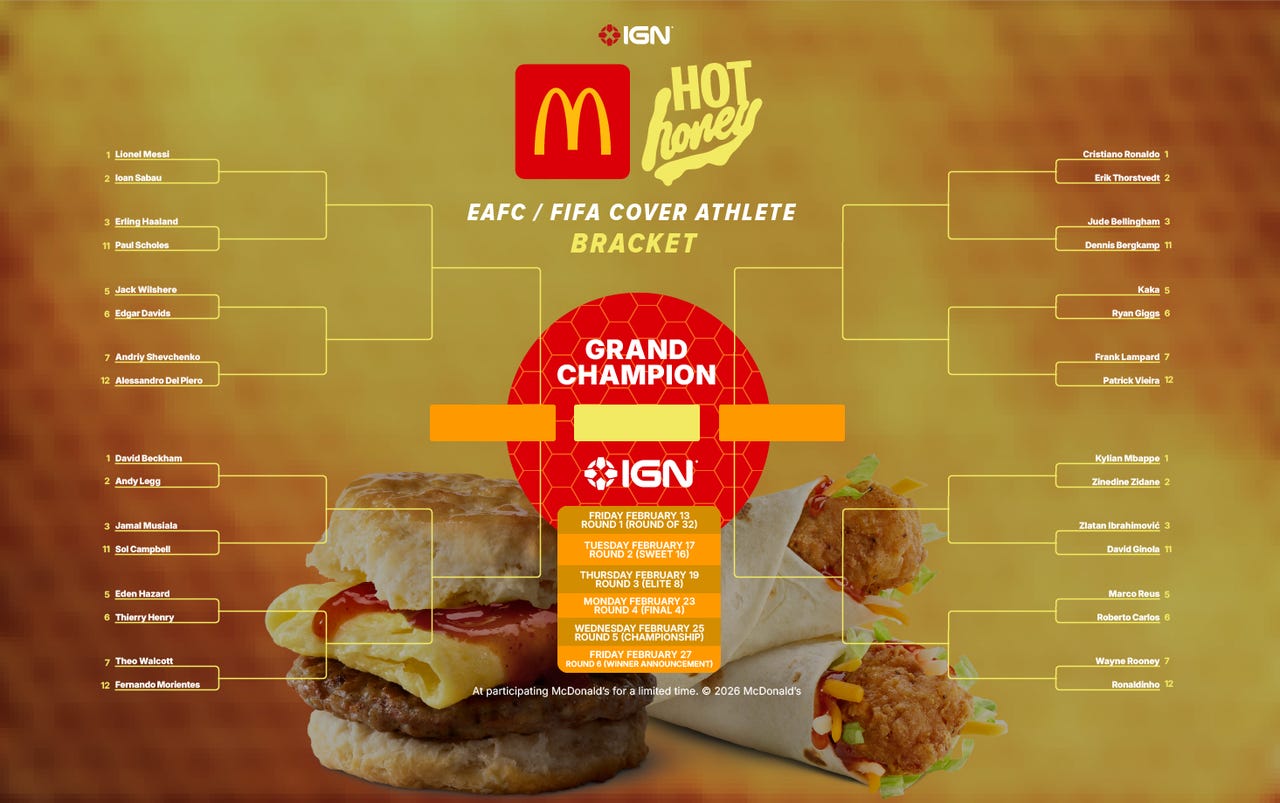 Criamos um torneio organizado pelo McDonald’s e seu molho quente de mel por tempo limitado. Assim como esses atletas da capa elevam a franquia FIFA/EAFC, o molho picante de mel leva seus favoritos para o próximo nível. O torneio contará com 32 atletas cover nos quais você pode votar, e eles abrangem toda a série, de Erik Thorstvedt (FIFA Soccer 95) a Jude Bellingham e Jamal Musiala (EA FC 26).