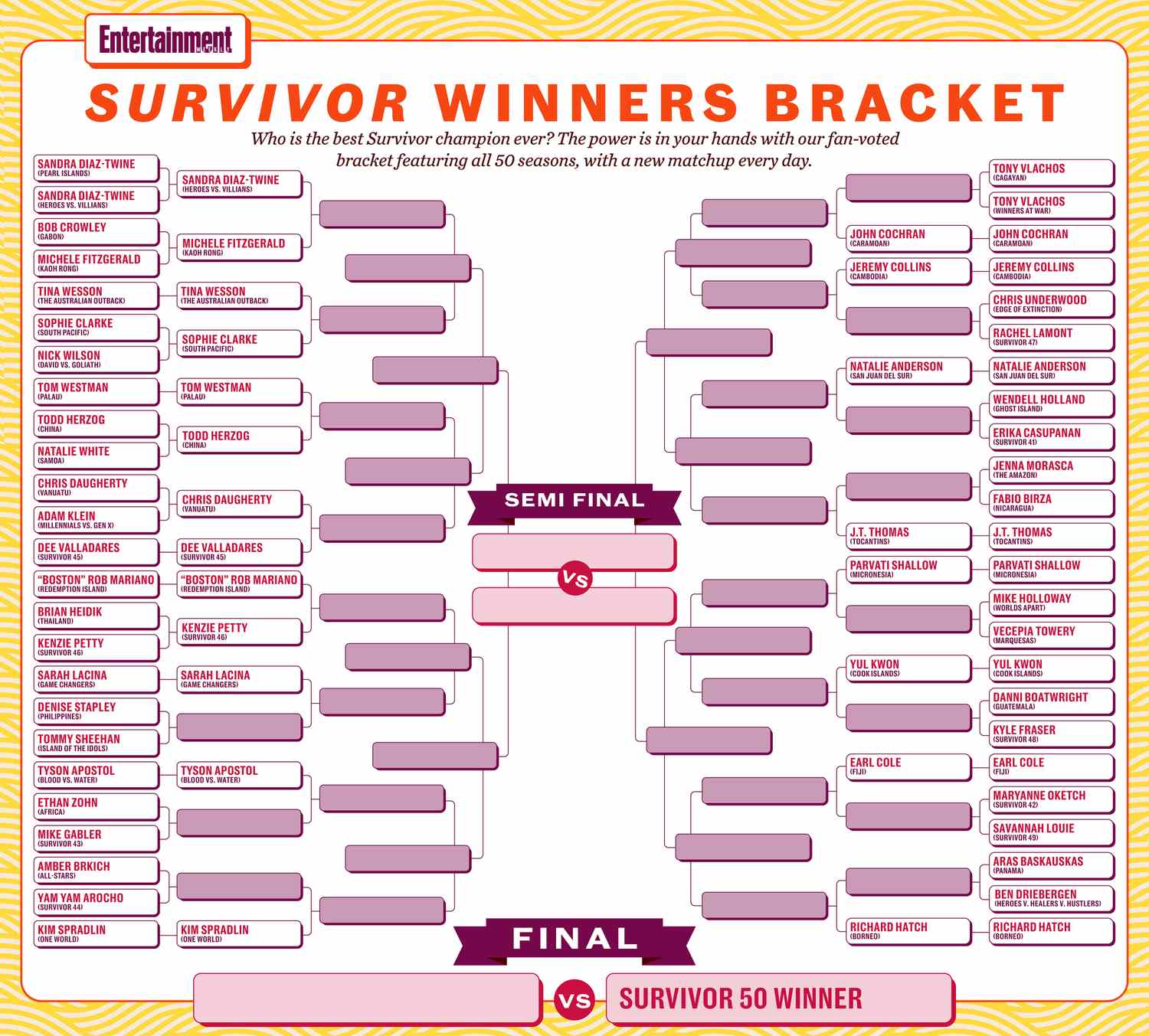 EW reuniu todas as 49 temporadas sobrevivente Vencedores, uma partida será disputada todos os dias até que o melhor jogador seja coroado na final sobrevivente 50 final. Então o vencedor é sobrevivente 50 Você pode jogar contra o rei ou a rainha nas chaves para ver quem sai por cima.