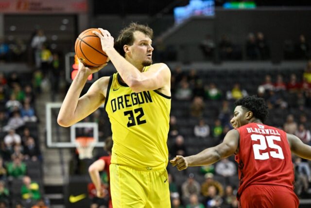 25 de fevereiro de 2026; Eugene, Oregon, EUA; O centro do Oregon Ducks, Nate Battle (32), pega um rebote durante o segundo tempo contra o Wisconsin Badgers na Matthew Knight Arena. Crédito obrigatório: Craig Strobeck-Imagn Images