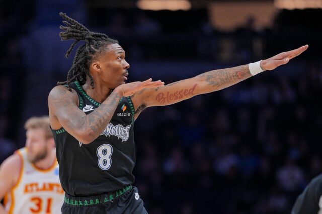 9 de fevereiro de 2026; Mineápolis, Minnesota, EUA; O armador do Minnesota Timberwolves, Bones Hyland (8), comemora sua cesta contra o Atlanta Hawks no segundo quarto no Target Center. Crédito obrigatório: Brad Rempel-IMAGN Images