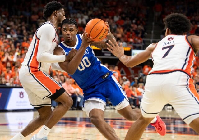 Auburn se recuperou de uma desvantagem de nove pontos no início do segundo tempo para conquistar uma vitória crucial por 75-74 em casa contra o Kentucky e manter vivas suas esperanças no torneio da NCAA. KeShaun Murphy marcou 17 de seus 25 pontos, o recorde de sua carreira, após o intervalo, e Auburn recebeu uma dica de Elijah Freeman faltando 1,2 segundos para o fim para reivindicar a vitória e quebrar uma seqüência de cinco derrotas consecutivas.