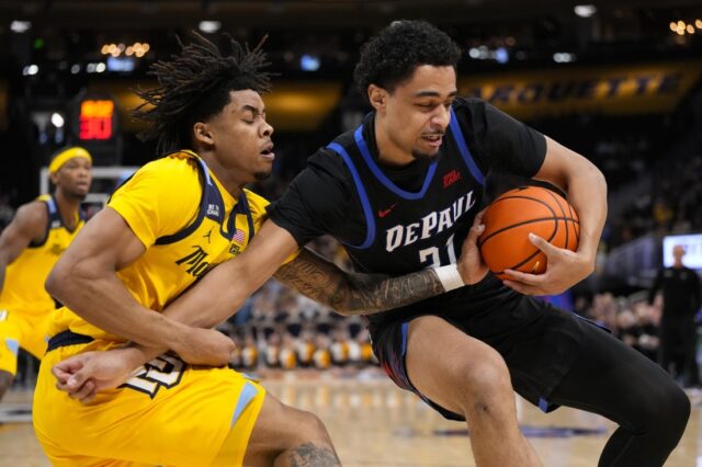 No final do intervalo, Marquette fez uma corrida de 16-2, acertou cinco dos sete arremessos do chão e derrubou DePaul quatro vezes nesse trecho. O déficit dos Golden Eagles foi reduzido para três.