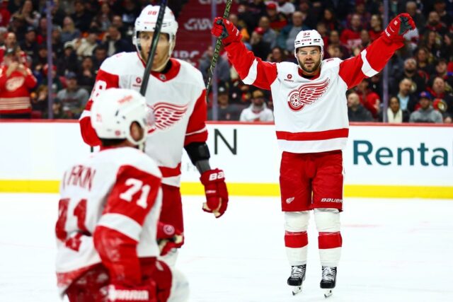 Larkin, medalhista de ouro olímpico pela equipe dos EUA, abriu a vitória com um passe para Lucas Raymond no gelo central. Larkin então ficou atrás de Shane Pinto, do Ottawa, fez um passe de retorno, deked e deslizou um chute de backhand entre as almofadas de Linus Almark para seu 28º gol na temporada.