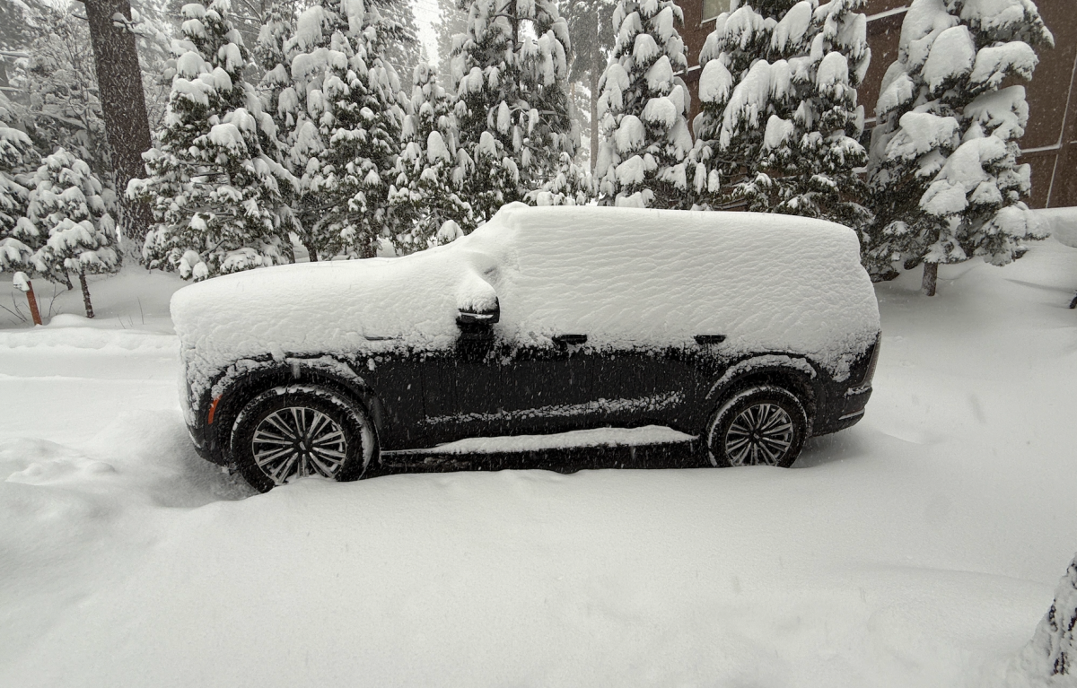 O que nos leva ao ponto mais baixo da viagem: chegar ao inverno de Tahoe. Apesar de todas as suas virtudes, o Escalade IQL é um motor sedento em qualquer medida. A bateria tem 205 kWh – enorme, e deveria ser, porque o carro queima cerca de 45 kWh por 160 quilômetros, o que é consideravelmente mais do que SUVs elétricos comparáveis. O Cadillac estima um alcance de 460 milhas com carga total e é mantido em condições ideais. Tahoe no inverno, porém, não apresenta condições ideais. Recebemos ainda menos cobrança do que deveríamos. Uma série de becos na estrada, entre as dificuldades de encontrar casacos para um familiar que não tinha nenhum embalado, gastei mais do que esperava na briga. No momento em que precisamos da carga, realmente precisamos cobrar.