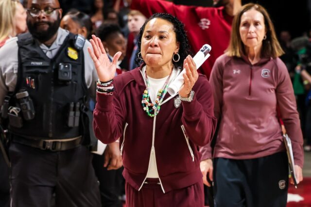 22 de fevereiro de 2026; Columbia, Carolina do Sul, EUA; O técnico do South Carolina Gamecocks, Don Staley, aplaude após derrotar os rebeldes do Mississippi na Colonial Life Arena. Crédito obrigatório: Jeff Black-Amigan Images