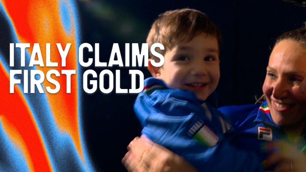 Francesca Lollobieda comemora com seu filho depois de ganhar a primeira medalha de ouro da Itália nos Jogos Olímpicos de Inverno deste ano na patinação de velocidade feminina de 3.000m.