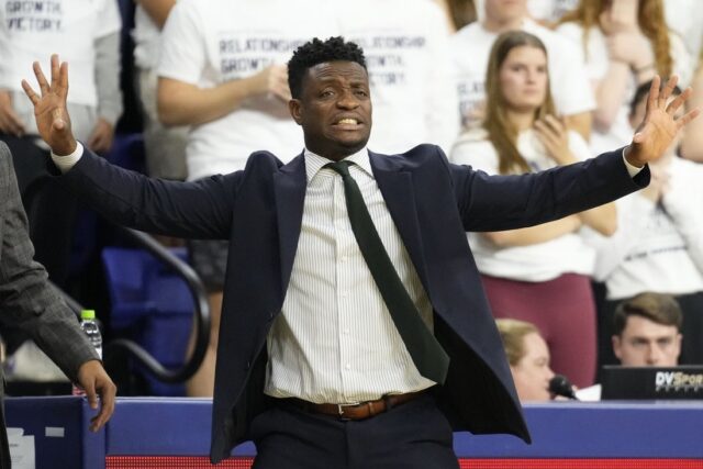 8 de novembro de 2024; Milwaukee, Wisconsin, EUA; O técnico do George Mason Patriots, Tony Skin, sinaliza para seus jogadores durante o primeiro tempo contra o Marquette Golden Eagles no Al McGuire Center. Crédito obrigatório: Jeff Heinsch-Amigan Images