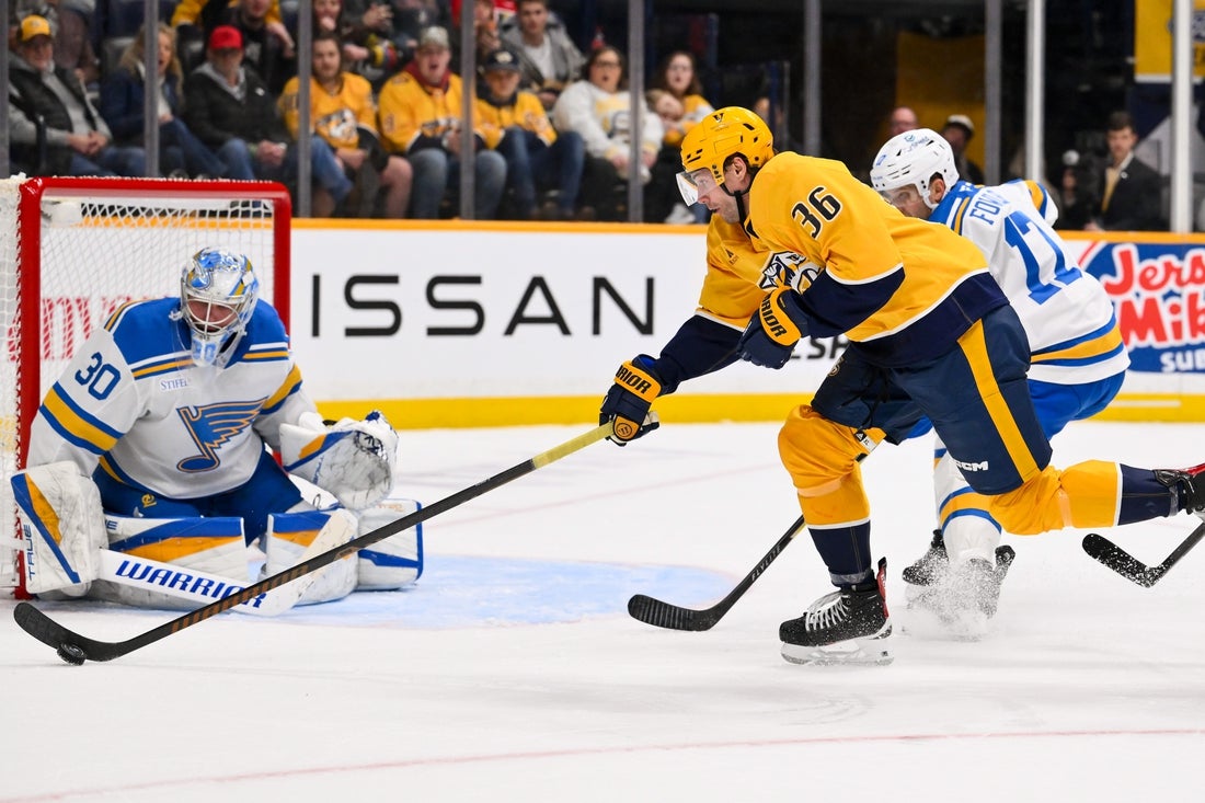 2 de fevereiro de 2026; Nashville, Tennessee, EUA; O goleiro do St. Louis Blues, Joel Hofer (30), bloqueia um chute do ala esquerdo do Nashville Predators, Cole Smith (36), durante o segundo período na Bridgestone Arena. Crédito obrigatório: Steve Roberts-Images