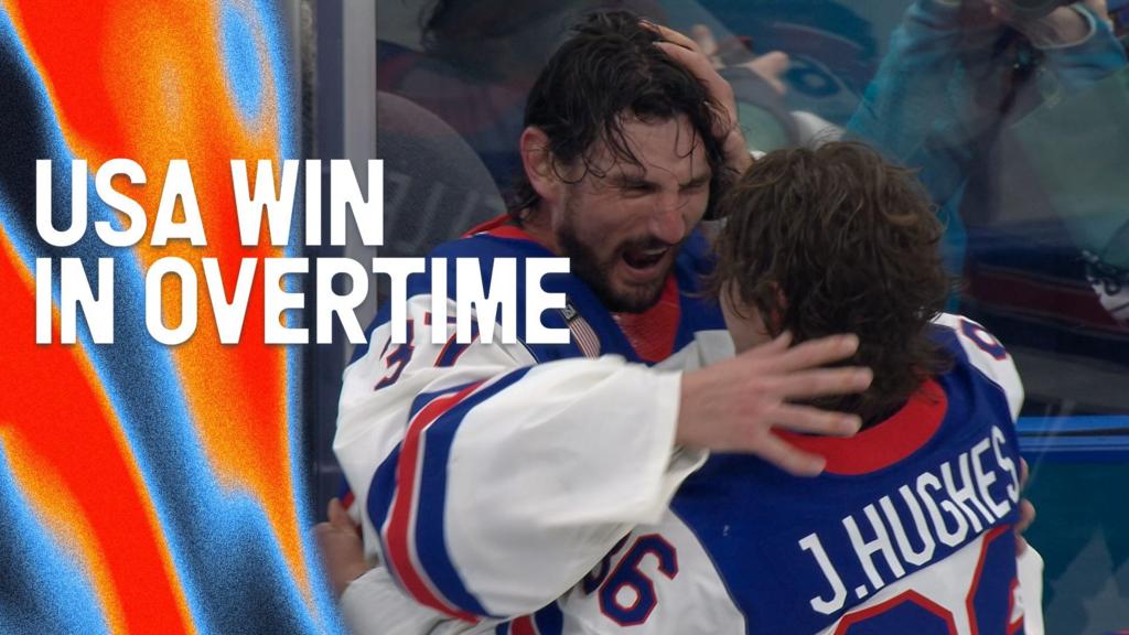 Jake Hughes marca na prorrogação para os EUA conquistarem a medalha de ouro contra o Canadá na final masculina de hóquei no gelo.