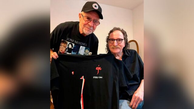 A foto principal da sessão mostra os dois músicos juntos: Leon segura uma camiseta preta com o icônico nome do álbum “Aja”, enquanto Charlie, sentado e relaxado, sorri de óculos e camisa escura. O ambiente é acolhedor e familiar, e a foto reflete a proximidade que se desenvolveu ao longo dos anos, onde foram compartilhadas cenas, projetos e uma visão única da música argentina. O próprio Jeiko aparece com camiseta e chapéu da Joni Mitchell, acrescentando alguns detalhes ao cenário de camaradagem e admiração mútua.