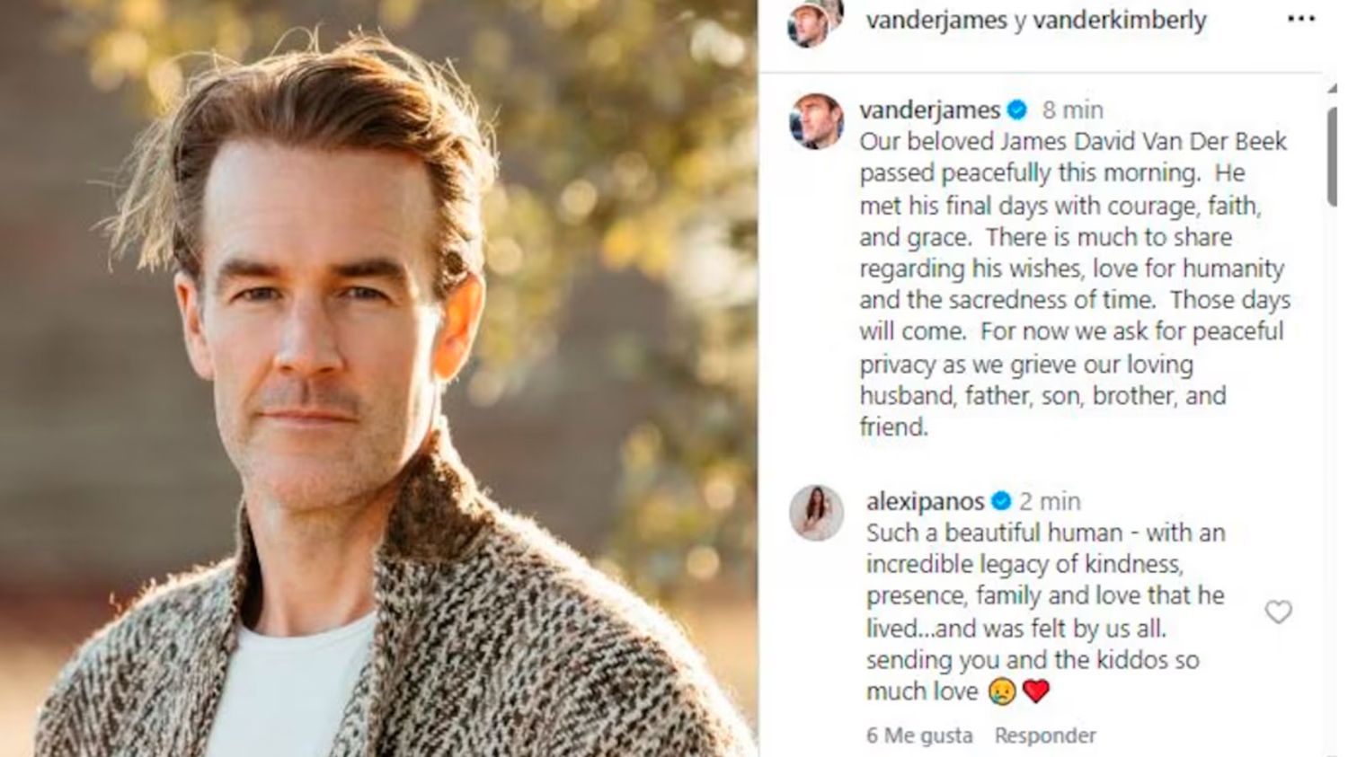 “Nosso querido James David van der Beek faleceu pacificamente esta manhã. Ele passou os últimos dias de sua vida com coragem, fé e dignidade. Há muito para compartilhar sobre seus desejos, seu amor pela humanidade e a santidade do tempo. Essa hora chegará. Neste momento, pedimos privacidade e paz pela perda do nosso amado marido, pai, filho, irmão e amigo.