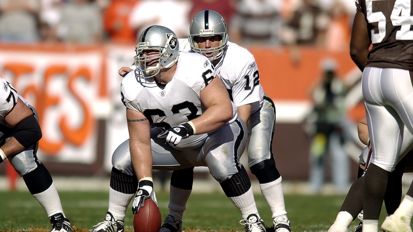 Barret Robbins (63) do Oakland Raiders se prepara para passar a bola para o quarterback Rich Gannon (12) durante um jogo contra o Cleveland Browns no Cleveland Browns Stadium, em Cleveland, em 12 de outubro de 2003. (David Maxwell/Imagens Getty)