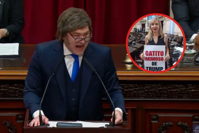 Durante seu discurso, o presidente interrompeu sua mensagem de ataque aos parlamentares de esquerda e os convocou Bergmann de Chilindrina Truskaenquanto ele exibia uma placa que o descrevia como tal “O gato de estimação de Trump”. A troca, repleta de piadas e gritos no banco, refletiu a profunda distância política entre o governo e os líderes da FIT.