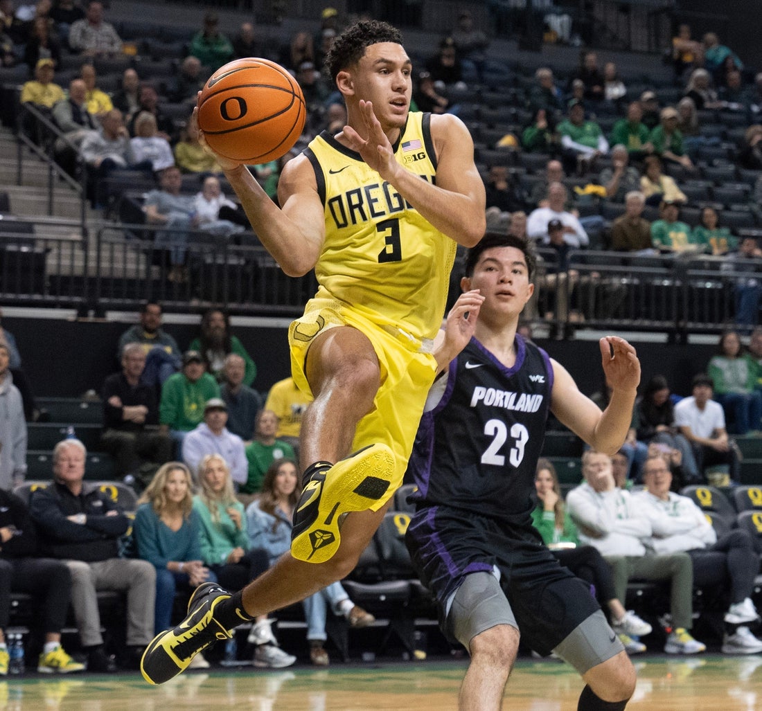 Jackson Shelstad, do Oregon, à esquerda, move a bola contra Joel Foxwell, do Portland, na Matthew Knight Arena em 17 de dezembro de 2025, em Eugene.