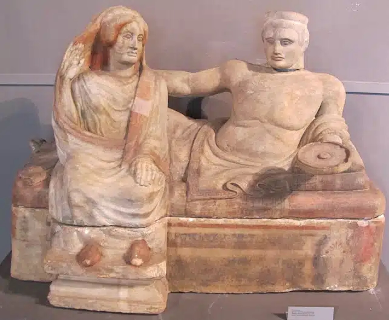 A urna, uma das obras-primas do Museu Arqueológico Nacional de Florença, foi severamente danificada na enchente de 1966 em Florença. Sessenta anos depois, uma restauração patrocinada pelo Escritório Federal Suíço de Cultura e realizada em cooperação com o museu trouxe de volta o esplendor e as cores da cena esculpida que representa dois casais abraçados.