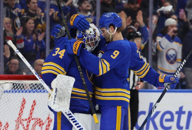 3 de março de 2026; Búfalo, Nova York, EUA; O goleiro do Buffalo Sabres, Alex Levine (34), comemora com o pivô Josh Norris (9) na vitória contra o Vegas Golden Knights no KeyBank Center. Crédito obrigatório: Timothy T. Ludwig-Imagn Images