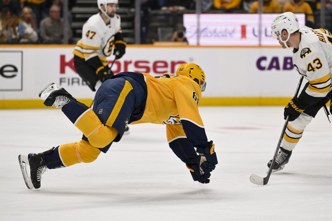 O Nashville Predators fechou o segundo período com três gols consecutivos para abrir um jogo de um gol e registrar uma vitória por 6 a 3 sobre o visitante Boston Bruins na noite de quinta-feira.