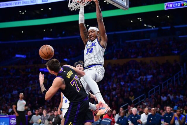 24 de fevereiro de 2026; Los Angeles, Califórnia, EUA; O pivô do Orlando Magic, Wendell Carter Jr. (34), enterrou para a cesta contra o armador do Los Angeles Lakers, Luka Donic (77), durante o primeiro tempo na Crypto.com Arena. Crédito obrigatório: Gary A. Vasquez-Imagn Images