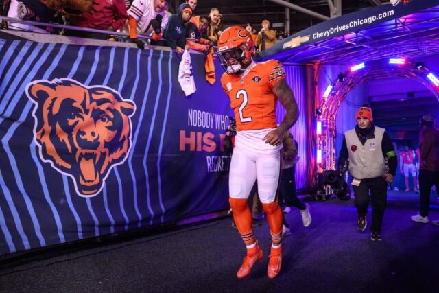 9 de novembro de 2023; Chicago, Illinois, EUA; O wide receiver do Chicago Bears, DJ Moore (2), entra em campo antes do jogo contra o Carolina Panthers no Soldier Field. Crédito obrigatório: Daniel Bartel-Amigan Images