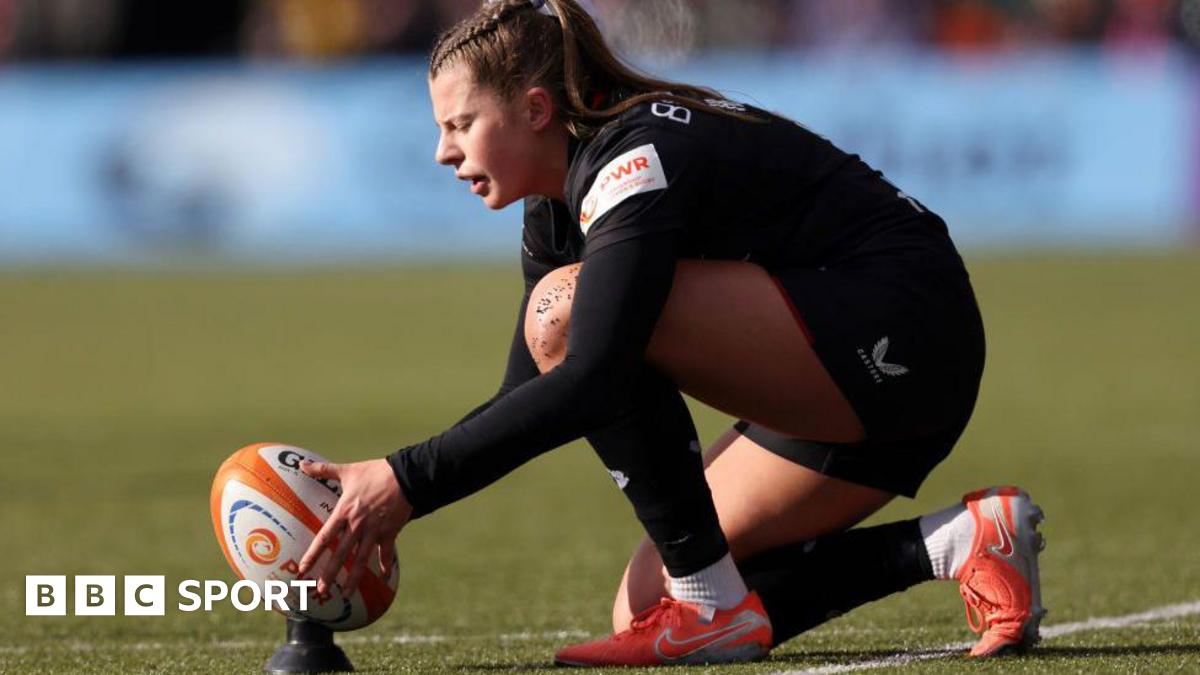 A meia-voadora da Inglaterra, Zoe Harrison, marca um pênalti de longa distância na vitória dos Saracens sobre o Bristol Bears por 36-33 no Stonex Stadium.