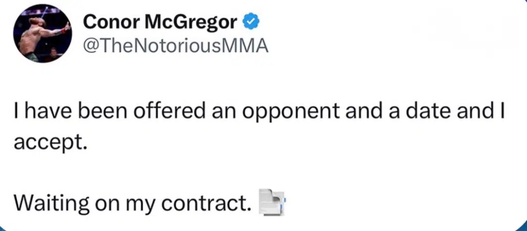 Na semana passada, o irlandês também afirmou que já recebeu uma data e um adversário para o seu regresso. Ele disse que aceitou a luta e agora espera um acordo.
