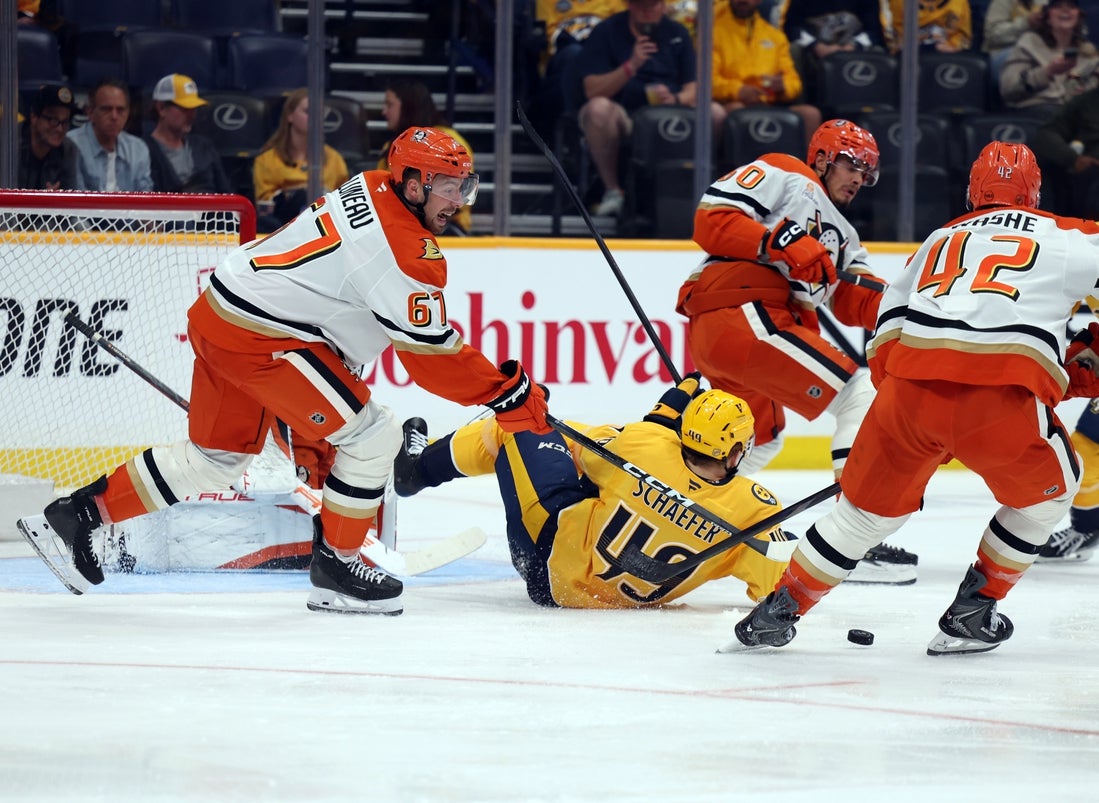Troy Terry, do Anaheim, marcou um pênalti em Nashville e marcou o gol de desempate no power play que se seguiu faltando 2:54 para o fim, dando aos Ducks visitantes uma vitória por 5-4 sobre os Predators no final da temporada regular para ambas as equipes na quinta-feira.