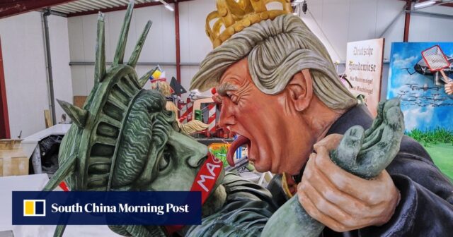 Trump dança atrevidamente com a Estátua da Liberdade como atração principal do carnaval alemão