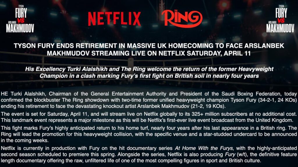 Para Fury, o confronto representa mais um capítulo em uma carreira marcada por reviravoltas dramáticas e aposentadorias. Será o sexto regresso desde o anúncio da reforma, dando continuidade a um padrão que definiu grande parte da sua vida profissional. A Netflix está atualmente desenvolvendo um documentário de longa-metragem intitulado “Fury”, que narra sua jornada ao longo da segunda temporada do reality show “Frozen at Home”.