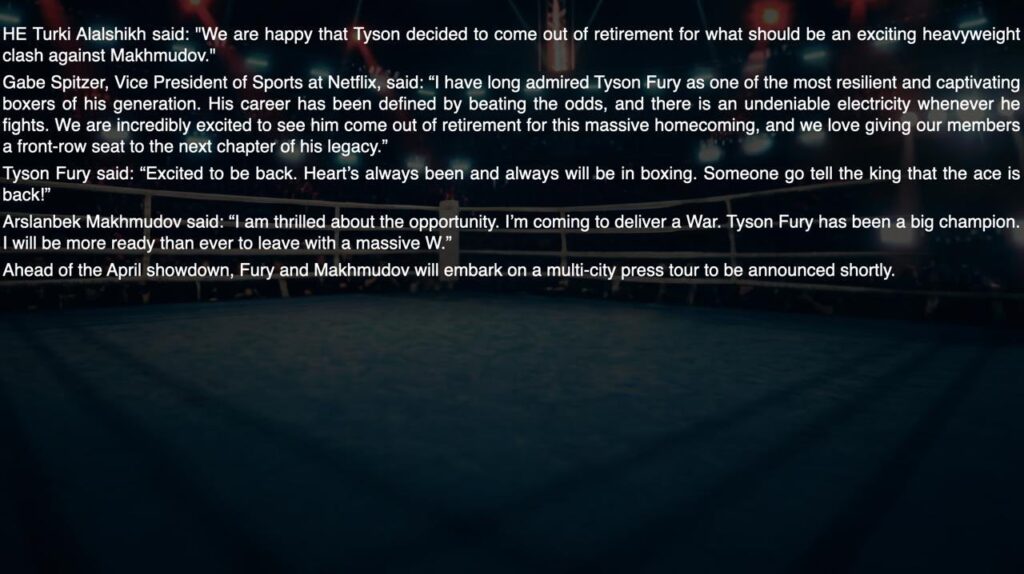 “Estamos muito satisfeitos que Tyson tenha decidido sair da aposentadoria para o que deveria ser um emocionante confronto de pesos pesados contra Makhmudov”, disse Alsheikh em comunicado.
