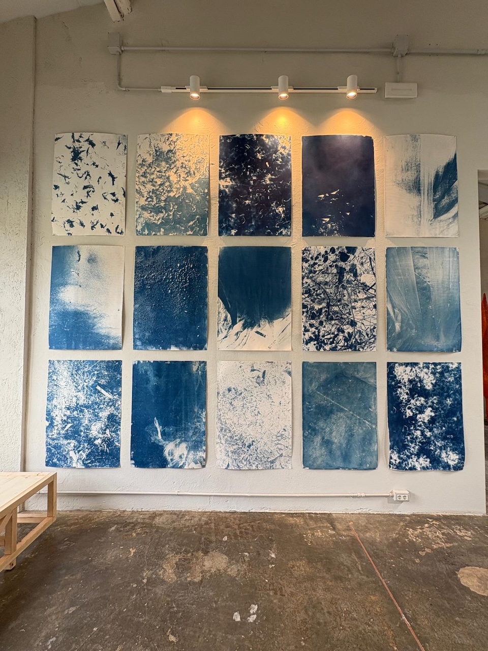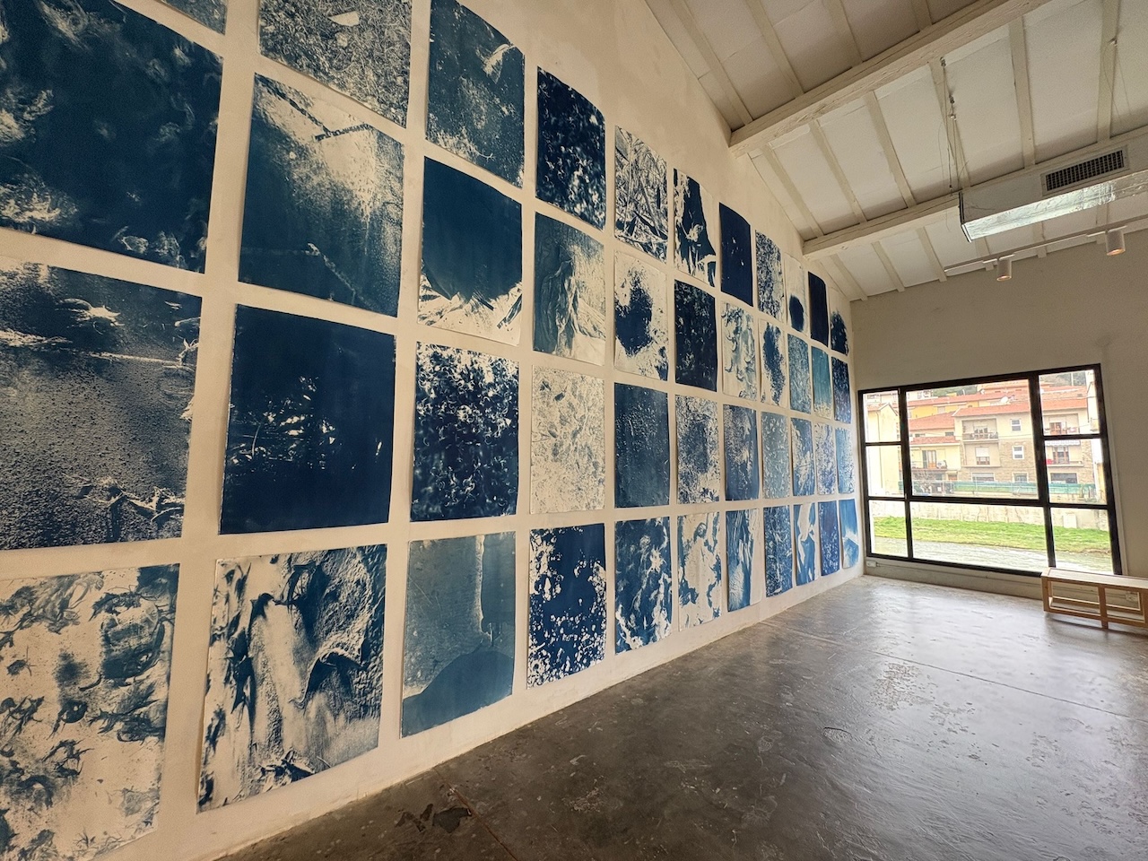 O projeto gira em torno do cianótipo, técnica fotográfica histórica que se baseia em processos químicos sensíveis. Pirri produziu 144 papéis para a instalação: 130 papéis de grau e materiais residuais, enquanto 14 são criados pela exposição direta das canetas à luz ultravioleta. O resultado é um campo imersivo de imensas superfícies azuis que refletem a memória, o tempo e a transformação material.