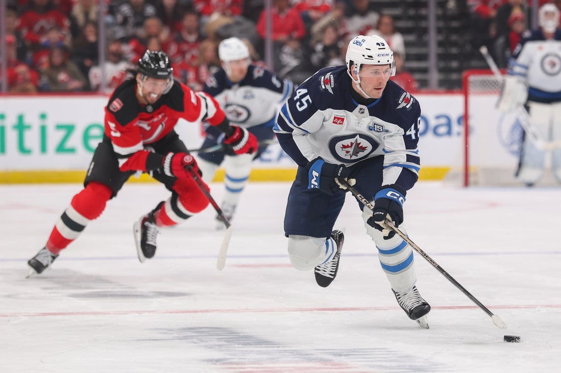 27 de janeiro de 2026; Newark, Nova Jersey, EUA; O ala do Winnipeg Jets, Cole Koepke (45), patina com o disco contra o New Jersey Devils durante o primeiro período no Prudential Center. Crédito obrigatório: Ed Mulholland-Amigan Images
